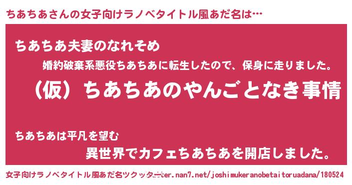 | 男性向けラノベタイトル風あだ名 | 『ちあちあの憂鬱』『チアチアスレイヤー』 |