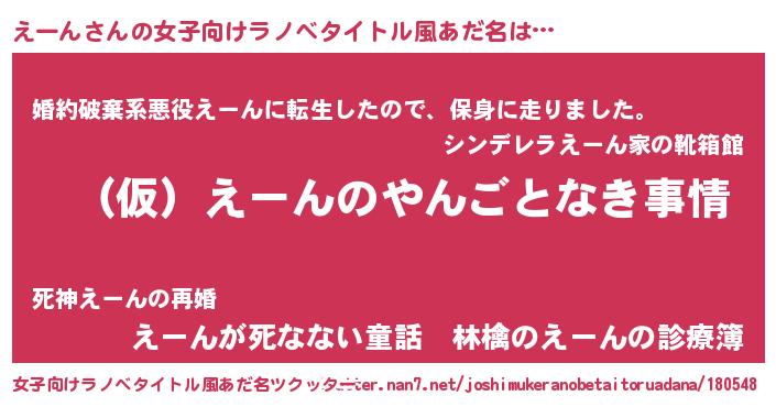 | 男性向けラノベタイトル風あだ名 | 『えーんの憂鬱』『魔弾の王とえーん』 |