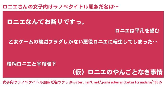 ロニエさんの女子向けラノベタイトル風あだ名は… 『乙女ゲームの破滅フラグしかない悪役ロニエに転生してしまった…』『ロニエなんてお断りですっ。』『(仮)ロニエのやんごとなき事情』 ツクッター #女子向けラノベタイトル風あだ名ツクッター http://tkutter.nan7.net/joshimukeranobetaitoruadana/18055/