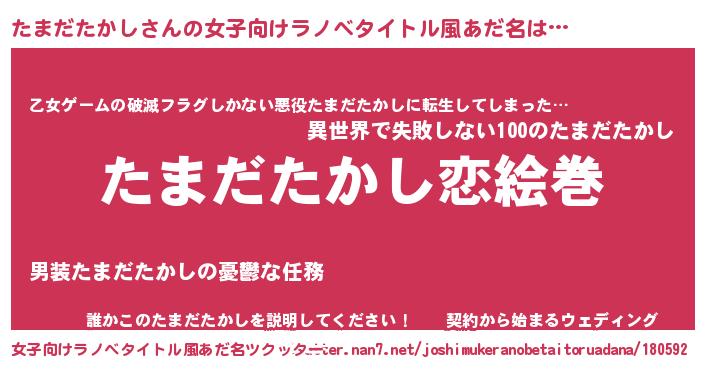 | 男性向けラノベタイトル風あだ名 | 『おまえをオタクにしてやるから、俺をたまだたかしにしてくれ! 』 |