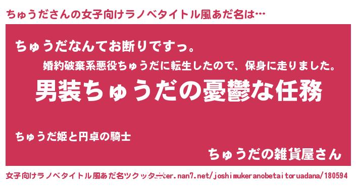 | 男性向けラノベタイトル風あだ名 | 『うちのちゅうだが世界を掌握している!』 |