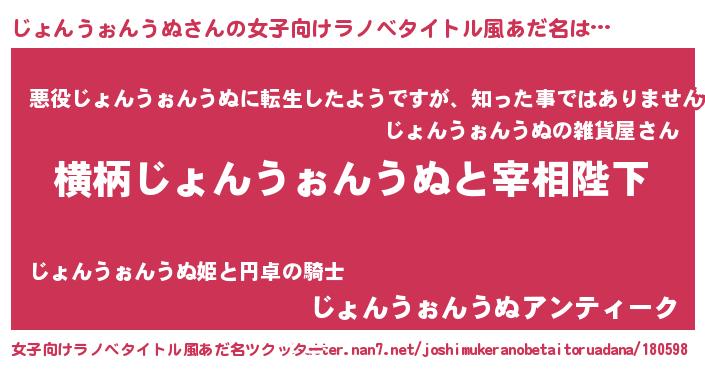 | 男性向けラノベタイトル風あだ名 | 『じょんうぉんうぬに滅ぼされるだけの簡単なお仕事です』 |