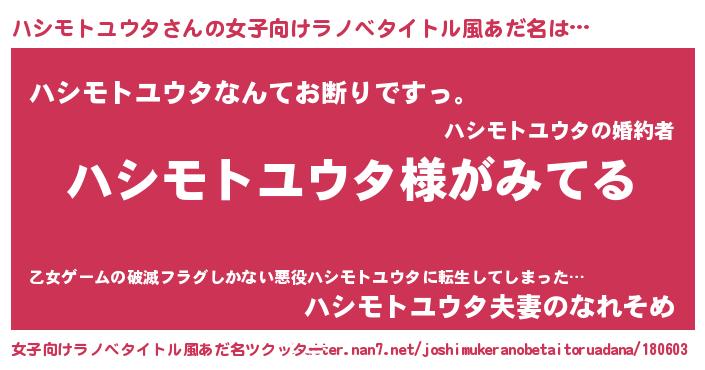 | 男性向けラノベタイトル風あだ名 | 『ハシモトユウタの嫁は女の子じゃないと思った?』 |