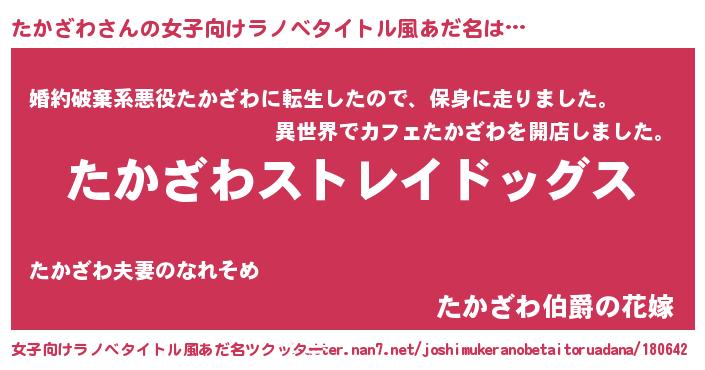 | 男性向けラノベタイトル風あだ名 | 『Re:たかざわから始める異世界生活』 |
