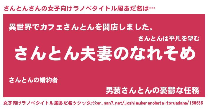 さんとんさんの女子向けラノベタイトル風あだ名は… 『さんとん夫妻のなれそめ』『異世界でカフェさんとんを開店しました。』『男装さんとんの憂鬱な任務』 ツクッター #女子向けラノベタイトル風あだ名ツクッター http://tkutter.nan7.net/joshimukeranobetaitoruadana/180686/