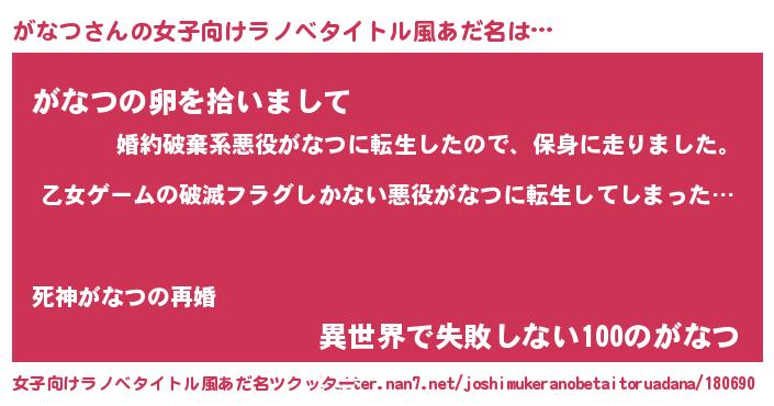 | 男性向けラノベタイトル風あだ名 | 『この素晴らしい世界にがなつを!』 |