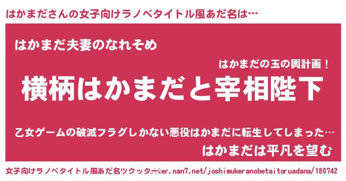 | 男性向けラノベタイトル風あだ名 | 『はかまだに滅ぼされるだけの簡単なお仕事です』 |