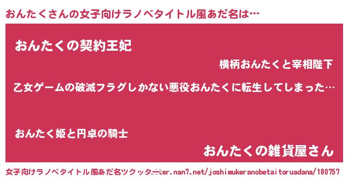 | 男性向けラノベタイトル風あだ名 | 『この素晴らしい世界におんたくを!』 |