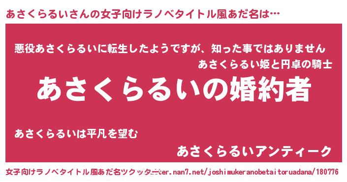 | 男性向けラノベタイトル風あだ名 | 『うちの娘の為ならば、俺はもしかしたらあさくらるいも倒せるかもしれない。』 |