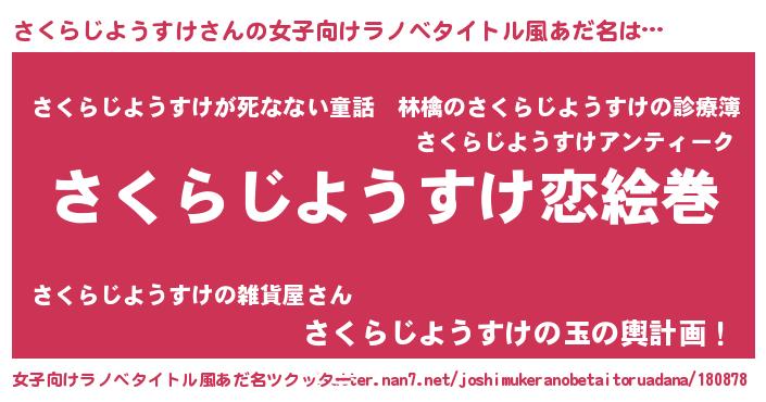 | 男性向けラノベタイトル風あだ名 | 『おまえをオタクにしてやるから、俺をさくらじようすけにしてくれ! 』 |