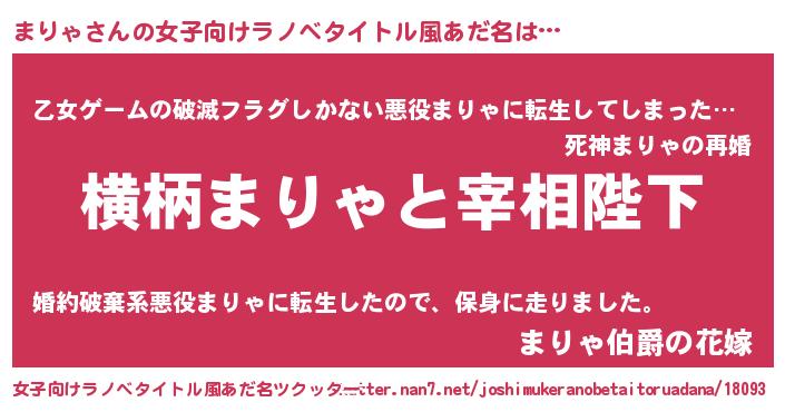 | 男性向けラノベタイトル風あだ名 | 『まりゃに滅ぼされるだけの簡単なお仕事です』 |