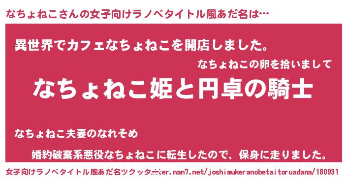 なちょねこさんの女子向けラノベタイトル風あだ名は… 『なちょねこ姫と円卓の騎士』『異世界でカフェなちょねこを開店しました。』『婚約破棄系悪役なちょねこに転生したので、保身に走りました。』 ツクッター #女子向けラノベタイトル風あだ名ツクッター http://tkutter.nan7.net/joshimukeranobetaitoruadana/180931/