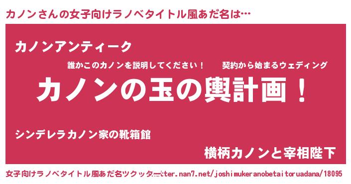 | 男性向けラノベタイトル風あだ名 | 『カノン~年齢イコール彼女いない歴の魔法使い~』 |