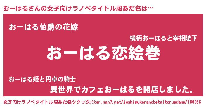 | 男性向けラノベタイトル風あだ名 | 『おまえをオタクにしてやるから、俺をおーはるにしてくれ! 』 |