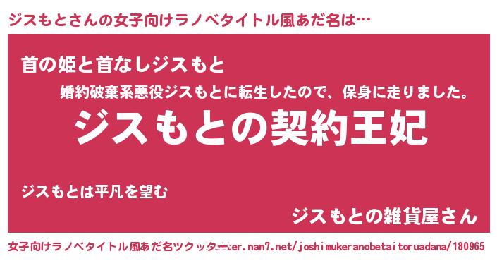 ジスもとさんの女子向けラノベタイトル風あだ名は… 『ジスもとの契約王妃』『首の姫と首なしジスもと』『ジスもとの雑貨屋さん』 ツクッター #女子向けラノベタイトル風あだ名ツクッター http://tkutter.nan7.net/joshimukeranobetaitoruadana/180965/