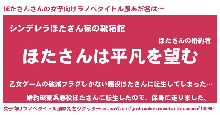 | 胡散臭い通販商品みたいなあだ名 | 『信頼と実績のサプリメント…その名も「ほたさん」』 |