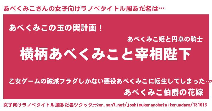 | 男性向けラノベタイトル風あだ名 | 『あべくみこに滅ぼされるだけの簡単なお仕事です』 |