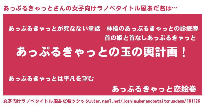 | 男性向けラノベタイトル風あだ名 | 『あっぷるきゃっと~年齢イコール彼女いない歴の魔法使い~』 |
