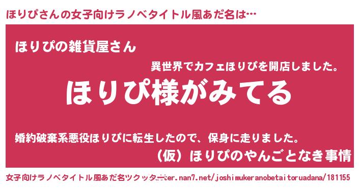 | 男性向けラノベタイトル風あだ名 | 『ほりぴの嫁は女の子じゃないと思った?』 |