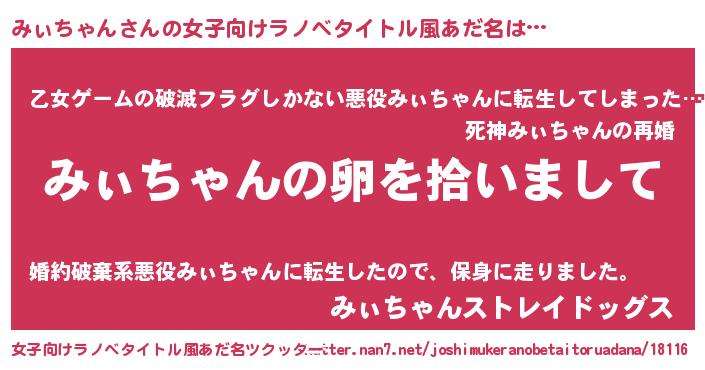 みぃちゃんさんの女子向けラノベタイトル風あだ名は… 『みぃちゃんの卵を拾いまして』『乙女ゲームの破滅フラグしかない悪役みぃちゃんに転生してしまった…』『みぃちゃんストレイドッグス』 ツクッター #女子向けラノベタイトル風あだ名ツクッター http://tkutter.nan7.net/joshimukeranobetaitoruadana/18116/
