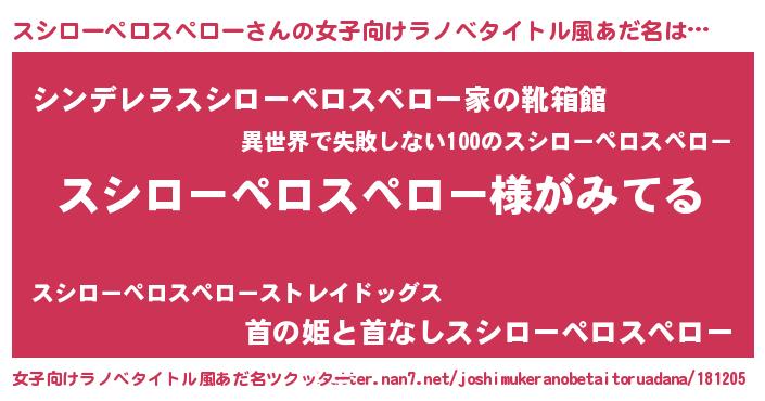 | 男性向けラノベタイトル風あだ名 | 『スシローペロスペローの嫁は女の子じゃないと思った?』 |
