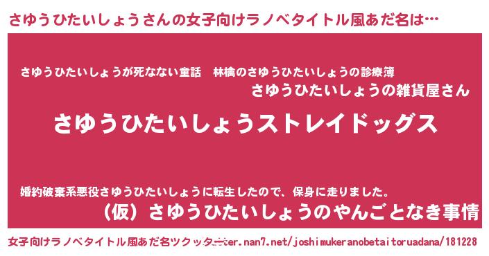 | 男性向けラノベタイトル風あだ名 | 『Re:さゆうひたいしょうから始める異世界生活』 |