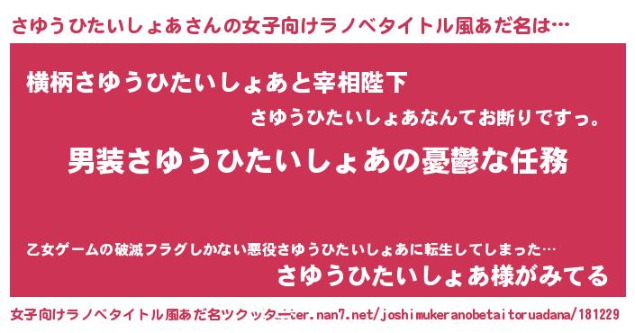 | 男性向けラノベタイトル風あだ名 | 『うちのさゆうひたいしょあが世界を掌握している!』 |