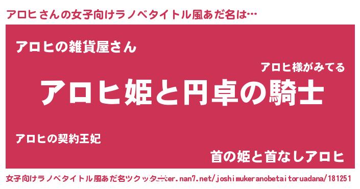 アロヒさんの女子向けラノベタイトル風あだ名は… 『アロヒ姫と円卓の騎士』『アロヒの雑貨屋さん』『首の姫と首なしアロヒ』 ツクッター #女子向けラノベタイトル風あだ名ツクッター http://tkutter.nan7.net/joshimukeranobetaitoruadana/181251/