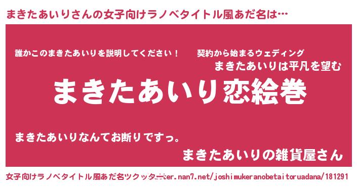 | 男性向けラノベタイトル風あだ名 | 『おまえをオタクにしてやるから、俺をまきたあいりにしてくれ! 』 |
