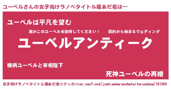 ユーベルさんの女子向けラノベタイトル風あだ名は… 『ユーベルアンティーク』『ユーベルは平凡を望む』『死神ユーベルの再婚』 ツクッター #女子向けラノベタイトル風あだ名ツクッター http://tkutter.nan7.net/joshimukeranobetaitoruadana/181309/