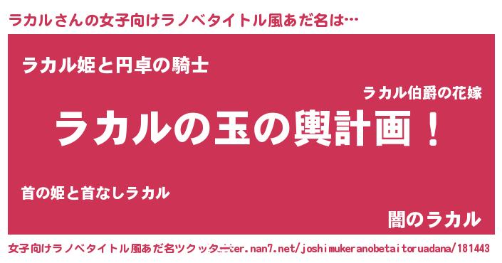 | 男性向けラノベタイトル風あだ名 | 『ラカル~年齢イコール彼女いない歴の魔法使い~』 |