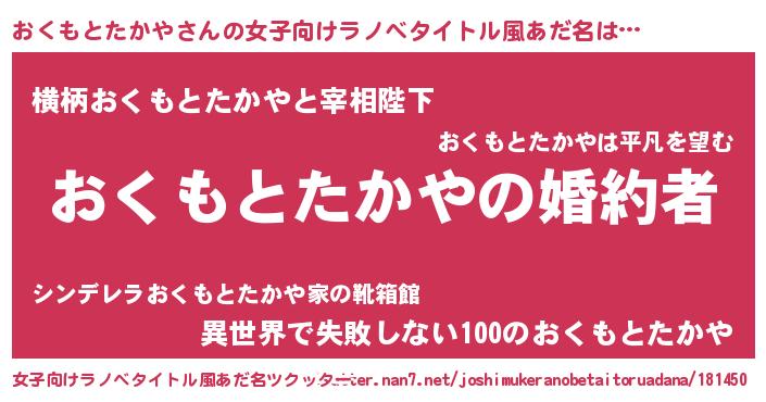 | 肩書あだ名 | 『おくもとたかや総理大臣』 |