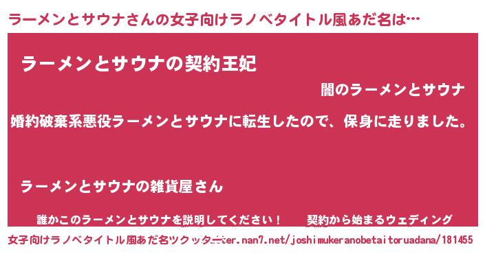| 男性向けラノベタイトル風あだ名 | 『ラーメントサウナスレイヤー』 |