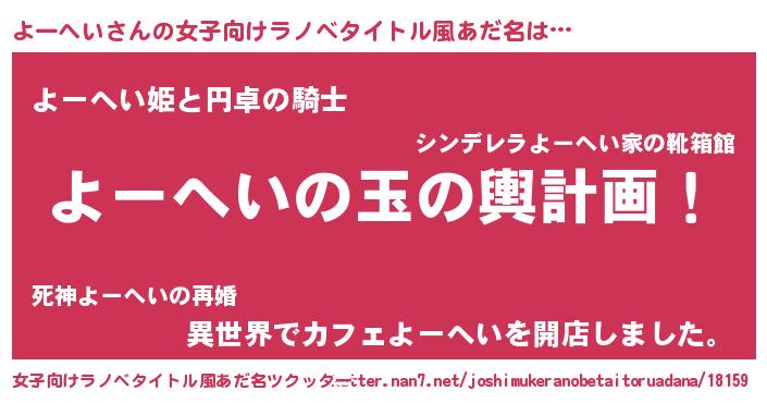 男性向けラノベタイトル風あだ名 | 『よーへい~年齢イコール彼女いない歴の魔法使い~』 |