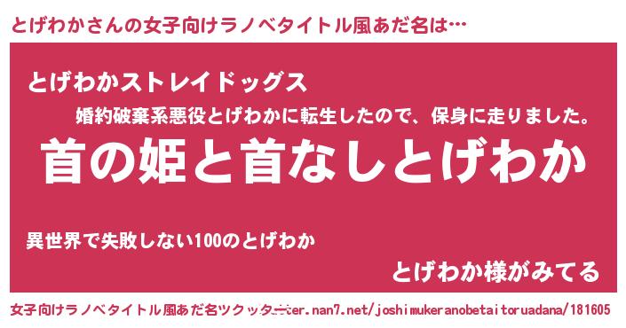 | 男性向けラノベタイトル風あだ名 | 『はたらくとげわかさま!』 |
