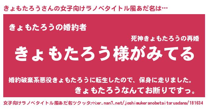 | 男性向けラノベタイトル風あだ名 | 『きょもたろうの嫁は女の子じゃないと思った?』 |