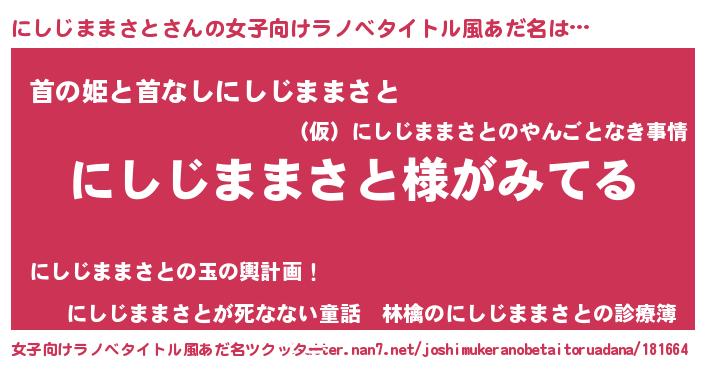| 男性向けラノベタイトル風あだ名 | 『にしじままさとの嫁は女の子じゃないと思った?』 |