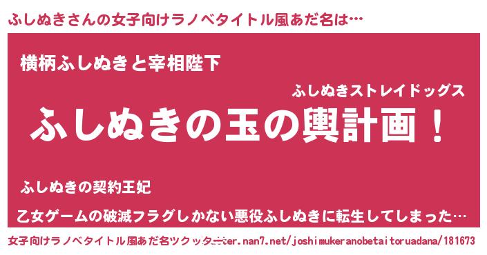 | 男性向けラノベタイトル風あだ名 | 『ふしぬき~年齢イコール彼女いない歴の魔法使い~』 |