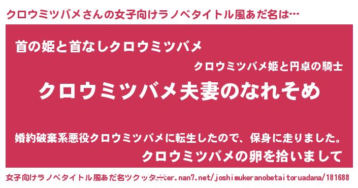 | 男性向けラノベタイトル風あだ名 | 『おまえをオタクにしてやるから、俺をクロウミツバメにしてくれ! 』 |