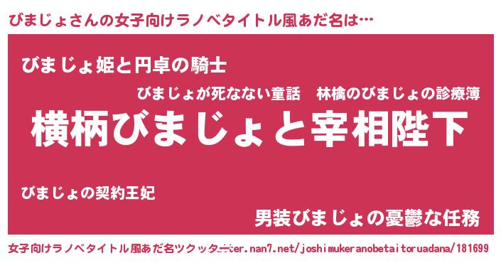 | 男性向けラノベタイトル風あだ名 | 『びまじょに滅ぼされるだけの簡単なお仕事です』 |