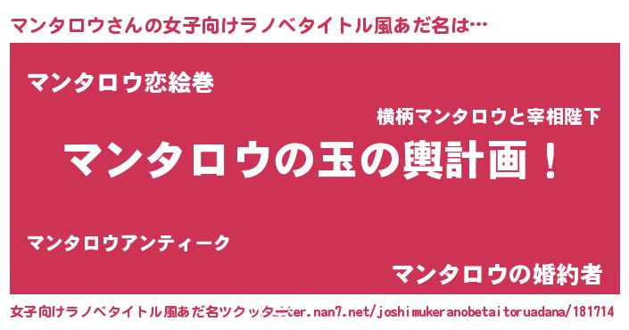 | 男性向けラノベタイトル風あだ名 | 『転生したらマンタロウだった件』 |