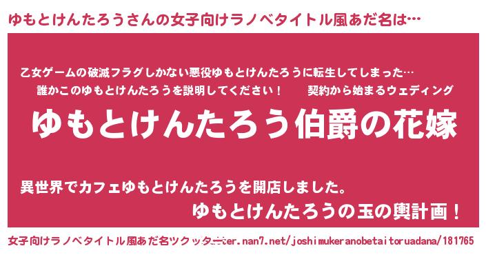 ゆもとけんたろうさんの女子向けラノベタイトル風あだ名は… 『ゆもとけんたろう伯爵の花嫁』『乙女ゲームの破滅フラグしかない悪役ゆもとけんたろうに転生してしまった…』『ゆもとけんたろうの玉の輿計画!』 ツクッター #女子向けラノベタイトル風あだ名ツクッター http://tkutter.nan7.net/joshimukeranobetaitoruadana/181765/