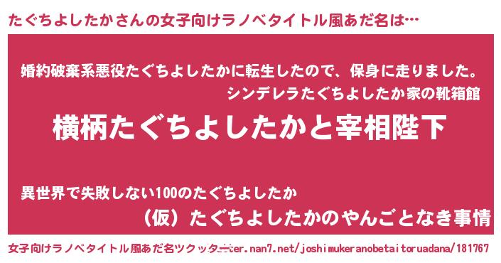 | 男性向けラノベタイトル風あだ名 | 『たぐちよしたかに滅ぼされるだけの簡単なお仕事です』 |