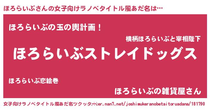 | 男性向けラノベタイトル風あだ名 | 『Re:ほろらいぶから始める異世界生活』 |
