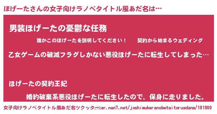 | 男性向けラノベタイトル風あだ名 | 『魔弾の王とほげーた』 |
