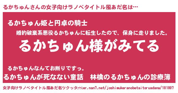 | 男性向けラノベタイトル風あだ名 | 『るかちゅんの嫁は女の子じゃないと思った?』 |