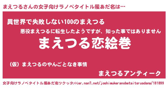 | 男性向けラノベタイトル風あだ名 | 『おまえをオタクにしてやるから、俺をまえつるにしてくれ! 』 |