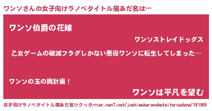 | 男性向けラノベタイトル風あだ名 | 『この素晴らしい世界にワンソを!』 |