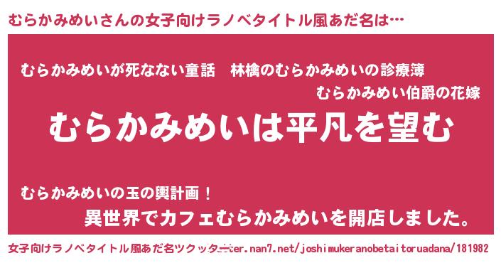 | 男性向けラノベタイトル風あだ名 | 『ダンジョンにむらかみめいを求めるのは間違っているだろうか』 |