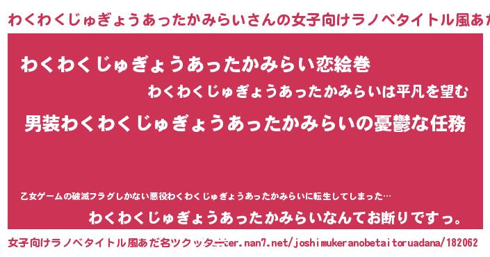 | 男性向けラノベタイトル風あだ名 | 『うちのわくわくじゅぎょうあったかみらいが世界を掌握している!』 |